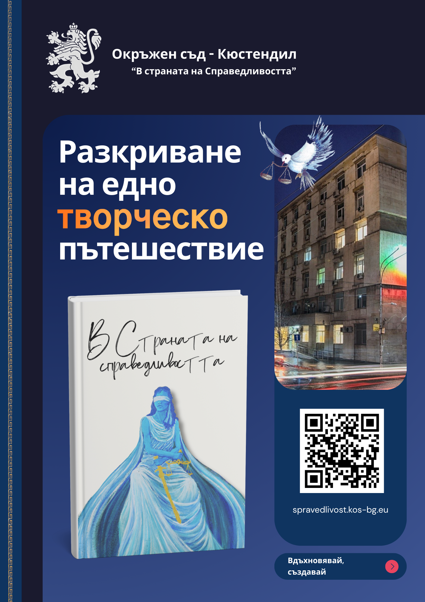 Окръжен съд Кюстендил, заедно с районните съдилища в Кюстендил и Дупница обявиха старта на шестото издание на Областния ученически конкурс „В страната на Справедливостта 2025 г.“. Новото предизвикателство за креативността на учениците е категория „Фотография- Снимай Справедливостта“. Останалите две категории са вече традиционни, доказали се във времето „Литературно творчество“ и „Изобразително изкуство“. Възрастовите групи са три: 1- 4 клас; 5- 7 клас и 8- 12 клас. За участие в конкурса не се допускат работи, с които авторът е участвал в други конкурси, както и такива, които са плагиат, копие или част от работата на други автори. Творбите не трябва да са генерирани от изкуствен интелект! Конкурсните материали трябва да бъдат получени най-късно до 03.11.2025 г., на адрес: Окръжен съд Кюстендил и Районен съд Кюстендил: Кюстендил 2500, ул. Гороцветна 31; Районен съд Дупница: Дупница 2600, ул. Николаевска 15. Конкурсът е част от образователната програма „Съдебната власт – информиран избор и гражданско доверие. Отворени съдилища и прокуратури”, през учебната 2025 / 2026 г...